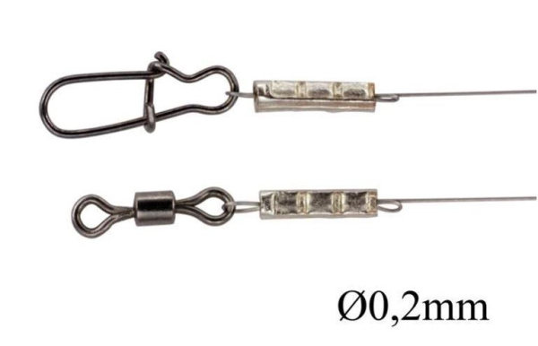 Данный вид поводков можно использовать для спиннинговой ловли класса ультралайт. Поводки имеют сверхмалый вес и очень малые размеры. В совокупности это вносит минимальное влияние на игру ультралайтовых приманок, масса которых сама по себе составляет граммы. В наличии есть поводки ультралайт из титанового сплава диаметром 0,2 и 0,3мм. Последний имеет чуть большую застежку и разрывную нагрузку, но более упругий. Нить 0,2мм сохраняет признаки упругости, но значительно более мягкая. Застежка на поводке 0,2мм чуть меньшего размера. Оценить реальные размеры вы можете на фото слева.